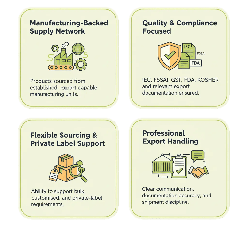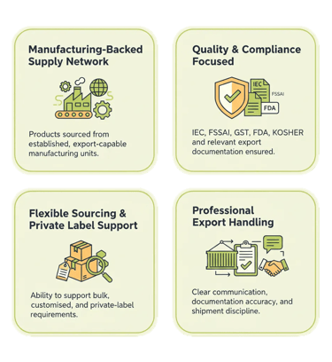 Export-ready food products sourced from reliable manufacturing partners, delivered with consistency, compliance, and care