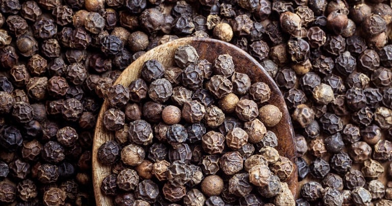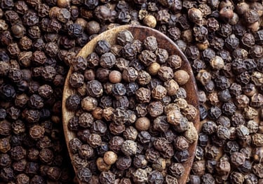 Black pepper is a flowering vine inPiperaceae, cultivated for its fruit, as a peppercorn, which is usually dried an used as a spice and seasoning. When fresh and fully mature, the fruit is about 5 mm (0.20 in) in diameter and dark, and contains a single seed, like all drupes.