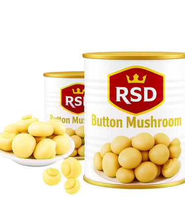 RSD Button Mushrooms are carefully selected, cleaned, and packed to retain their natural taste and texture. They can be eaten raw or cooked, making them perfect for salads, pizzas, pastas, stir-fries, and curries. Available in 400 gm, 800 gm, and 3 kg cans.