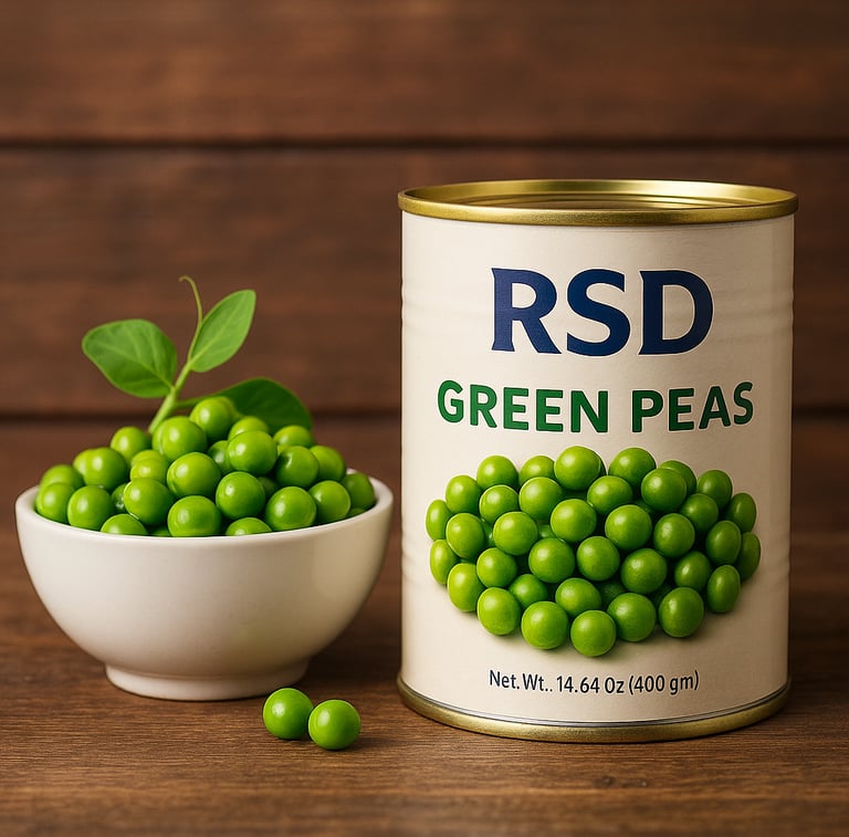 RSD Green Peas are tender, sweet, and packed fresh to preserve their natural colour and taste. Perfect for pulao, curries, soups, and salads, they can be used directly without hassle. Available in 400 gm and 800 gm cans.