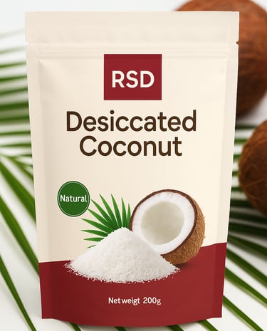 Desiccated Coconut, made from fresh, mature coconuts that are finely grated, dried, and hygienically packed. Our desiccated coconut is 100% natural, with no added sugar or preservatives—perfect for baking, confectionery, desserts, curries, and snack preparations.